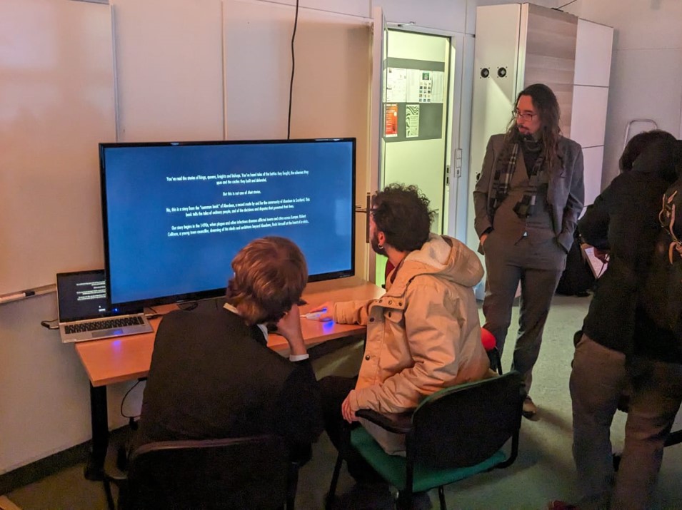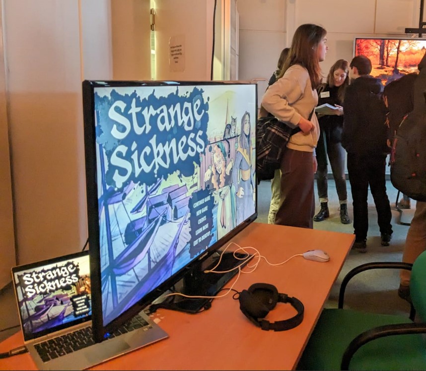 They spoke on ‘Historical primary sources in video games’, exploring ideas about how games can expose historical practice and drawing on their game making experience in Strange Sickness. They were there in true hybrid fashion – William in person while Jackson joined online. The workshop was expertly organised and hosted by Dr Eduardo Luersen and Dr James Wilson : they’re in the photo playing Strange Sickness at the evening session in the GameLab.