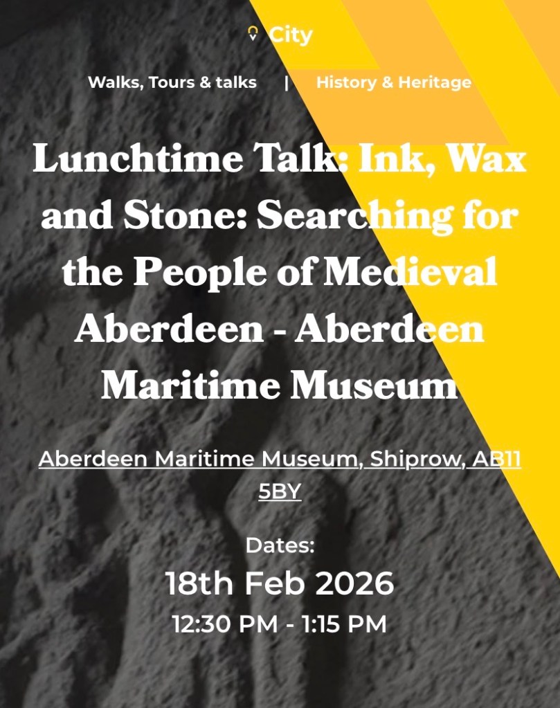 The talk explored how the people of medieval Aberdeen made their imprints on the world. They set down in written records aspects of their lives, work, possessions and identities. The more prominent among them affixed personal wax seals to documents to prove their authenticity. Some left memorials to themselves and their relatives carved in stone. Through these and other types of sources – some clear and some more mysterious, and some now held far away from Aberdeen – we can trace fragments of stories of the people who made the burgh their home.