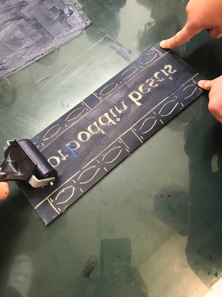 The class groups focused on themes of animals, fish and seafaring in medieval Aberdeen. The Middle Scots phrases ‘rede and suet’ (for salmon) and ‘forboddin bestis’ (for unruly escaped pigs) formed the focus of the artworks that the pupils made in stages by using different printing techniques. PhD student Jovi Fawcett brought examples of medieval and modern bones of sheep and pigs to the school, for the groups to handle. Jackson challenged the pupils to test their palaeography skills and decode examples of letters and words in the ARO.